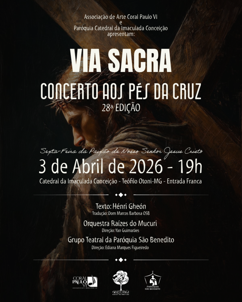 A Paróquia Catedral da Imaculada Conceição de Teófilo Otoni, em parceria com a Associação de Arte Coral Paulo VI, a Orquestra Raízes do Mucuri e o Grupo Cênico Teatral da Paróquia São Benedito, tem o prazer de apresentar o espetáculo Via-Sacra (Concerto aos Pès da Cruz – 28ª Edição). No apagar das luzes da Sexta-feira Santa, somos convidados para um momento de profunda meditação sobre o fato que nos salvou e do qual fazemos respeitosa e silenciosa memória neste dia.
